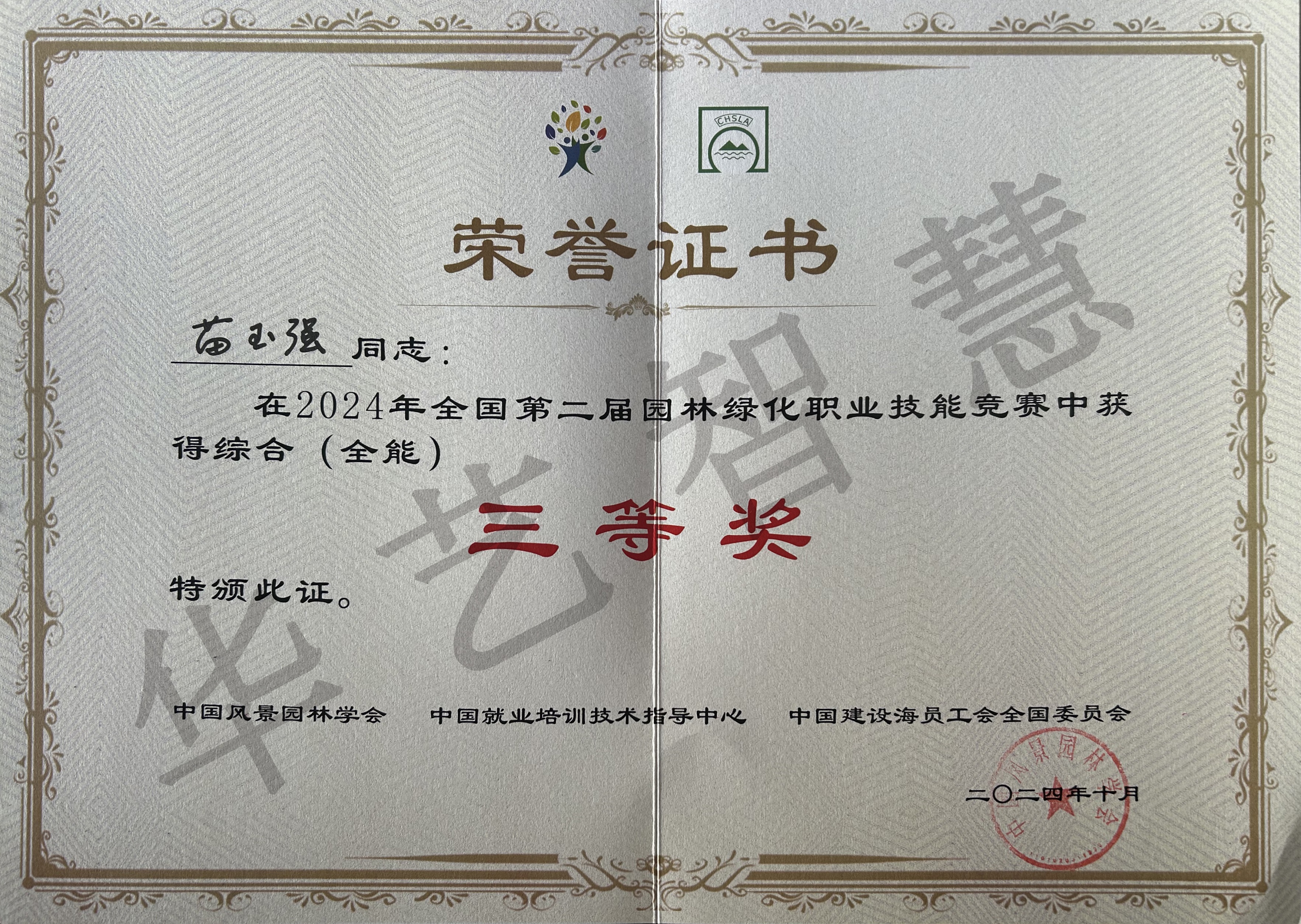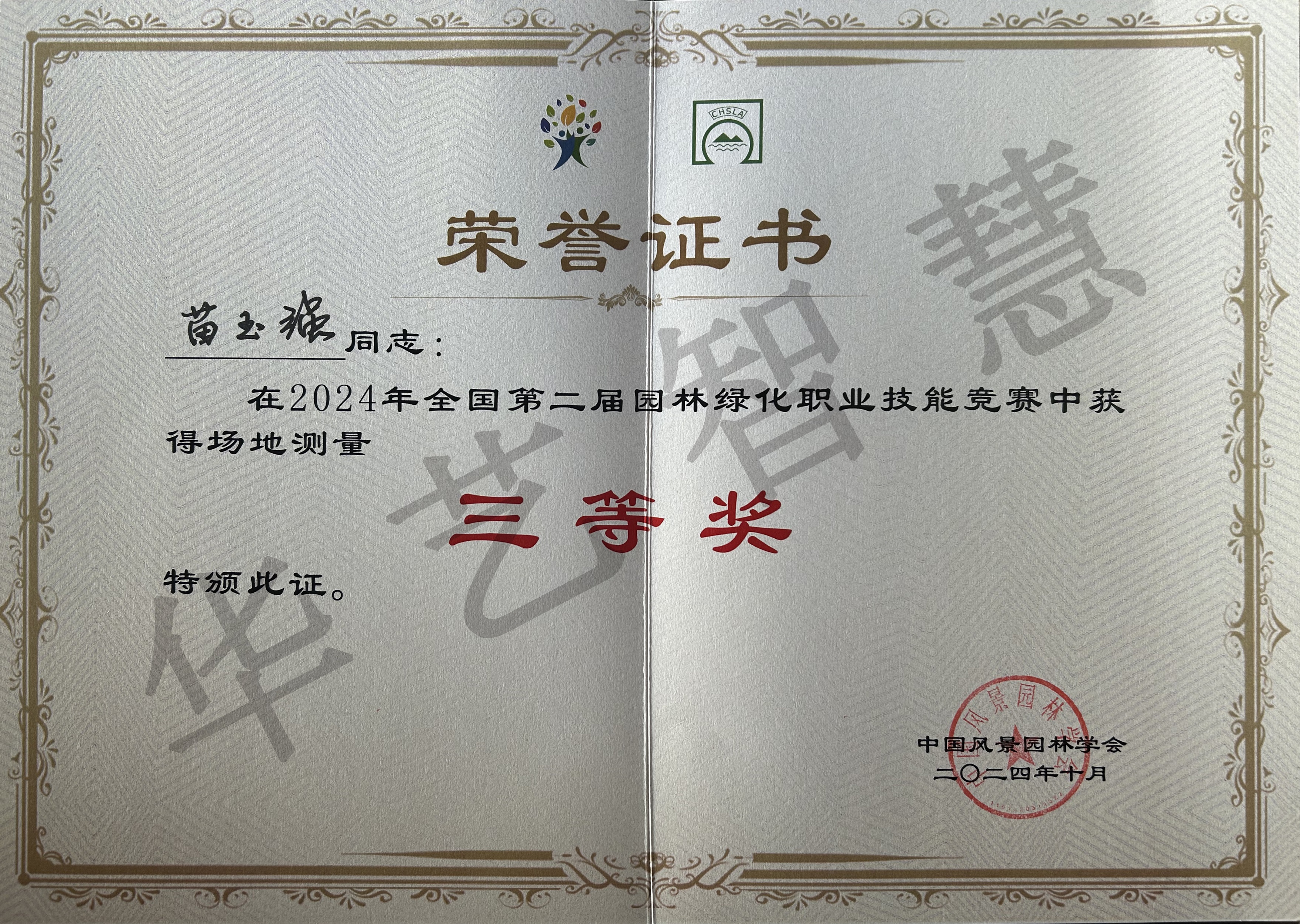 2024年10月25—28日,由中國風景園林學會、中國就業(yè)培訓技術指導中心和中國海員建設工會全國委員會聯(lián)合主辦的“2024年全國第二屆園林綠化職業(yè)技能競賽”在北京隆重舉行。華藝智慧科技股份有限公司工程師苗玉強憑借扎實的專業(yè)知識、精湛的技藝和卓越的團隊協(xié)作精神,從眾多選手中脫穎而出,榮獲綜合(全能)三等獎、場地測量三等獎。